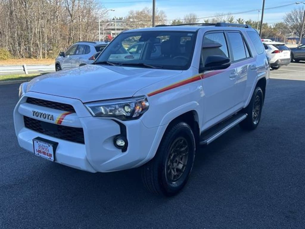 Experience adventure and style in this White 2023 Toyota 4Runner 4x4 40th Anniversary Special Edition SUV. Built for capability and comfort, it features a powerful 4.0L V6 engine, 4WD with an electronic hi-lo selector, and signature special graphics. Enjoy modern tech like an 8-inch touchscreen, Apple CarPlay, Android Auto, Amazon Alexa, and Toyota Connected Services. Safety is a priority with features including Front and Pedestrian Automatic Emergency Braking, Blind Spot Monitoring, Rear Cross Traffic Alert, Lane Deviation Sensors, and a rearview camera. The cabin offers heated front seats, leatherette upholstery with contrast stitching, power-adjustable front seats, and a power moonroof for an elevated driving experience. Convenience abounds with adaptive cruise control, integrated navigation, remote keyless entry, and multiple USB outlets. This 4Runner's blend of ruggedness, advanced features, and comfort makes it the ideal SUV for daily drives and off-road adventures alike. Why Buy at Glen Toyota in Fair Lawn, NJContact Glen Toyota for your Toyota automotive needs! We have the latest Toyota models. Search our Pre-Owned Toyota inventory and contact our internet sales department for current specials or to schedule a test drive. Located in Fair Lawn, NJ, our internet sales team provides excellent savings to customers in the Fair Lawn, Paramus, Clifton, and Garfield areas. Contact our dealership online for an internet quote. Includes: Toyota Gold Certified Program